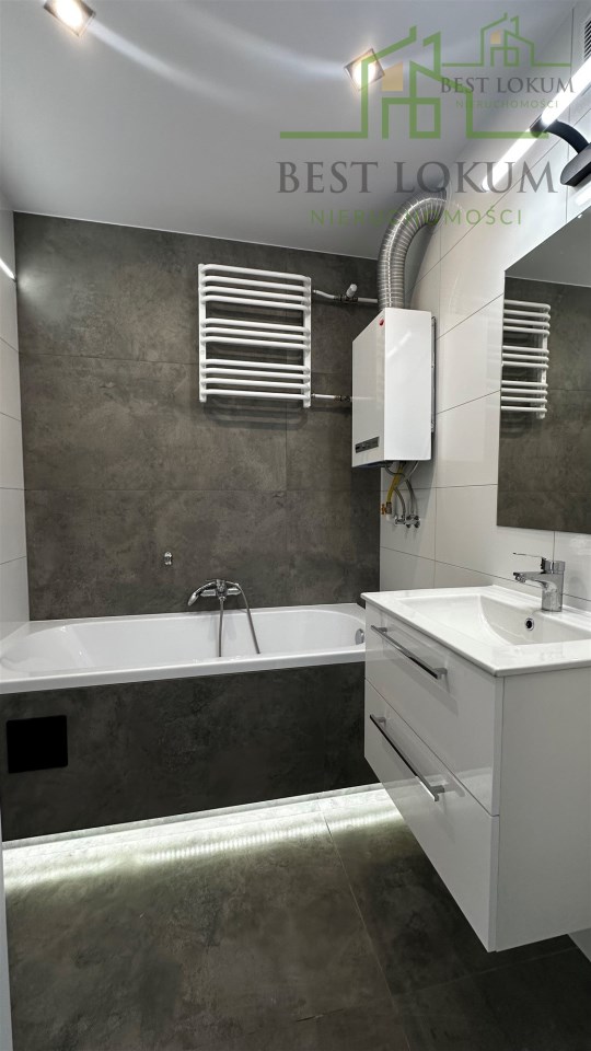 Nowoczesna łazienka z wanną, która spełni oczekiwania nawet najbardziej wymagających. Osobne wc wraz z umywalką.